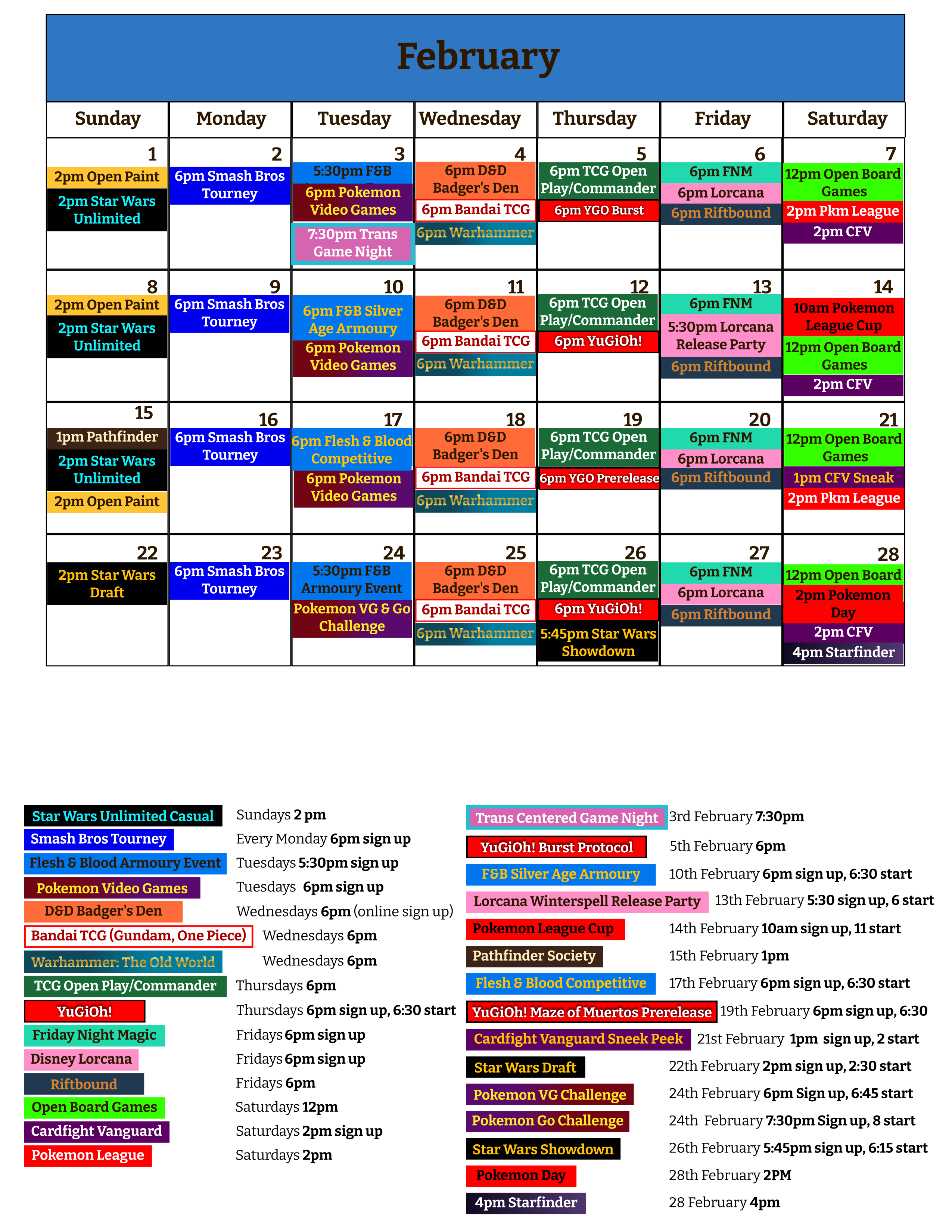 For the table top fanatics our weekly hosting of the Badger's Den for D&D is every Wednesday, and our Pathfinder and Starfinder nights are the 15th and 28th respectively